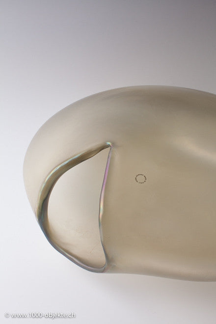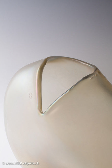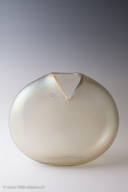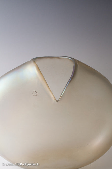 • Clear glass, iridescent strong. Mouth unilaterally cut deeply total. In Vibrogravur marked:. Venini Millenium III 43/99 and Ligaturmonogramm. of the designer. Orig - adhesive label manufacture.