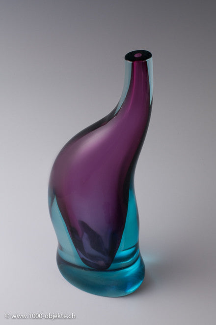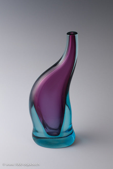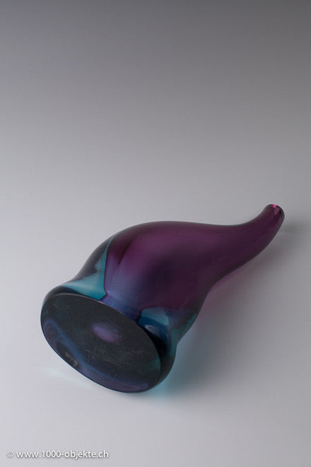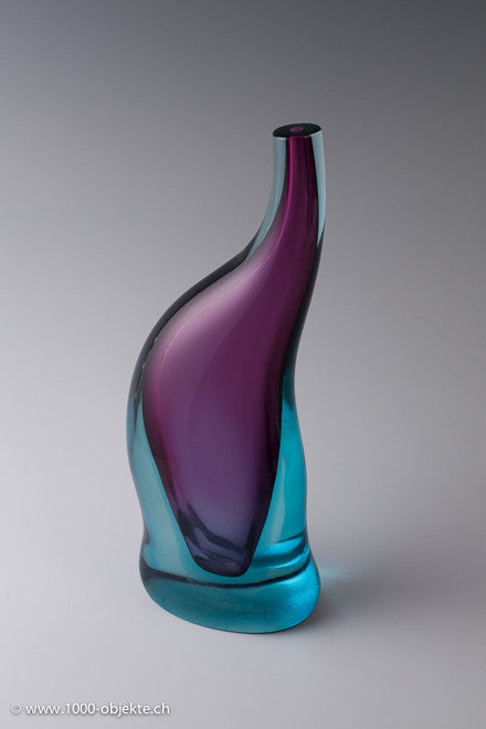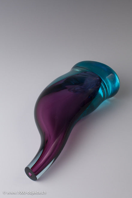 • Amorphous form with trunk-like neck, an oval footprint.Thick-walled casing glass, colorless, turquoise and purple.
