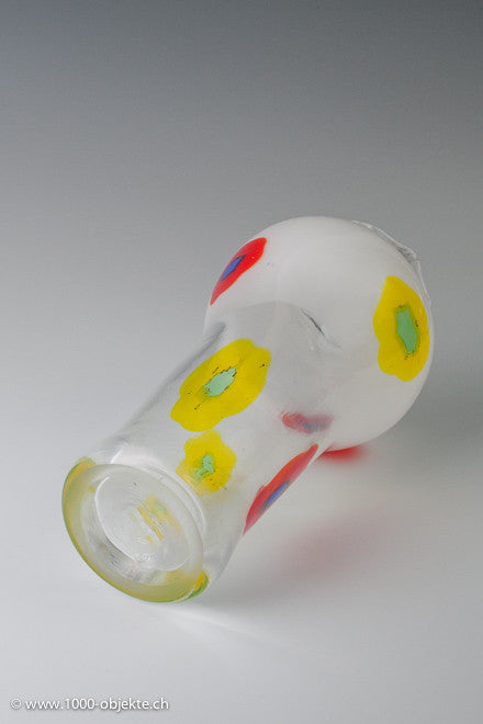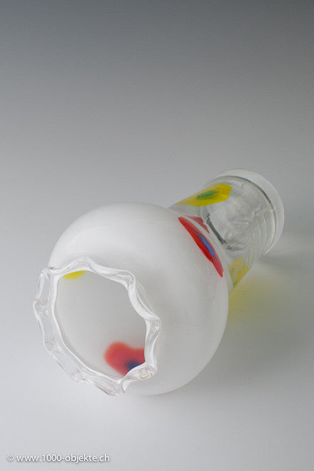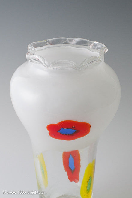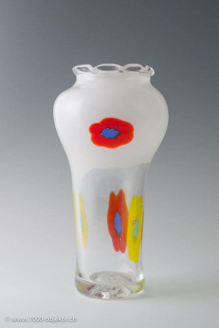 • Flat stand, zylindrical form with flared sides on the top with scalloped irregular rim, clear glass, white cased on the top and irregular, big murrine flowers in red, blue, yellow and blue.