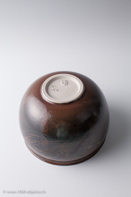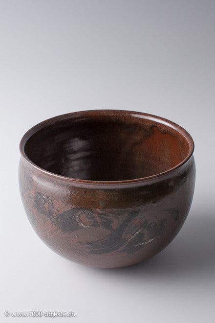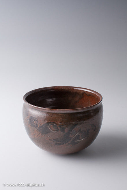 • Stoneware, thin-walled. Black brown glaze with applied in sheets glaze painting