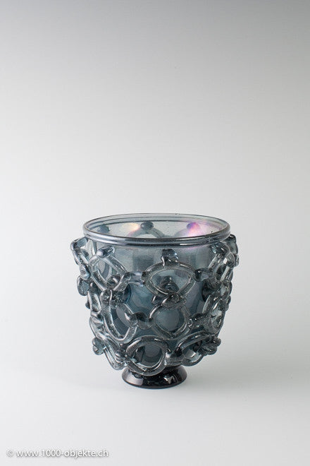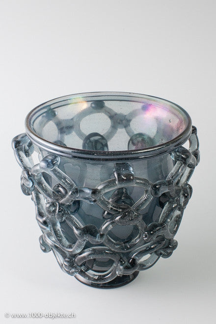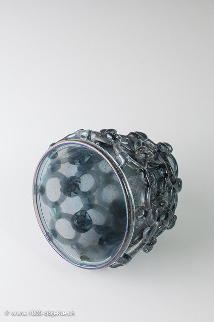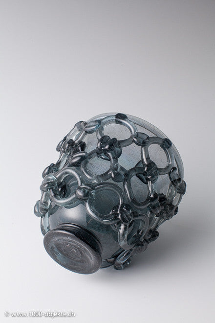 • Grey glass, with corroso interior and iridized surface. With old pontil break