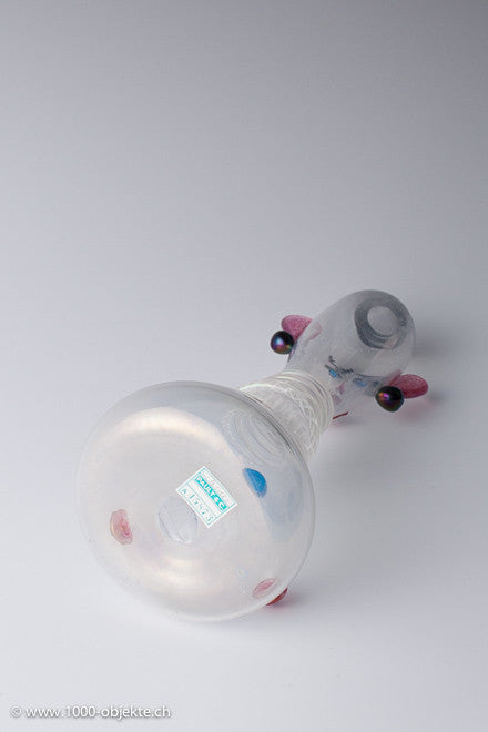 • Glass decanter with stopper with applications in milk glass and pasta  colored  glasses, made by Livio Zanetti .
