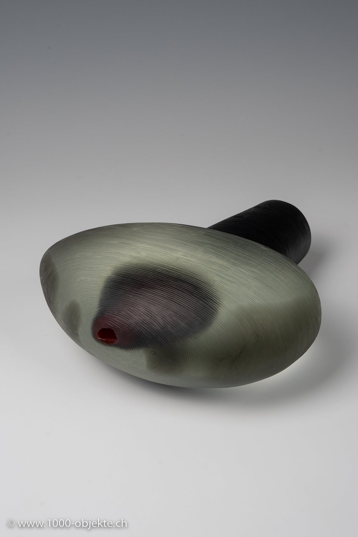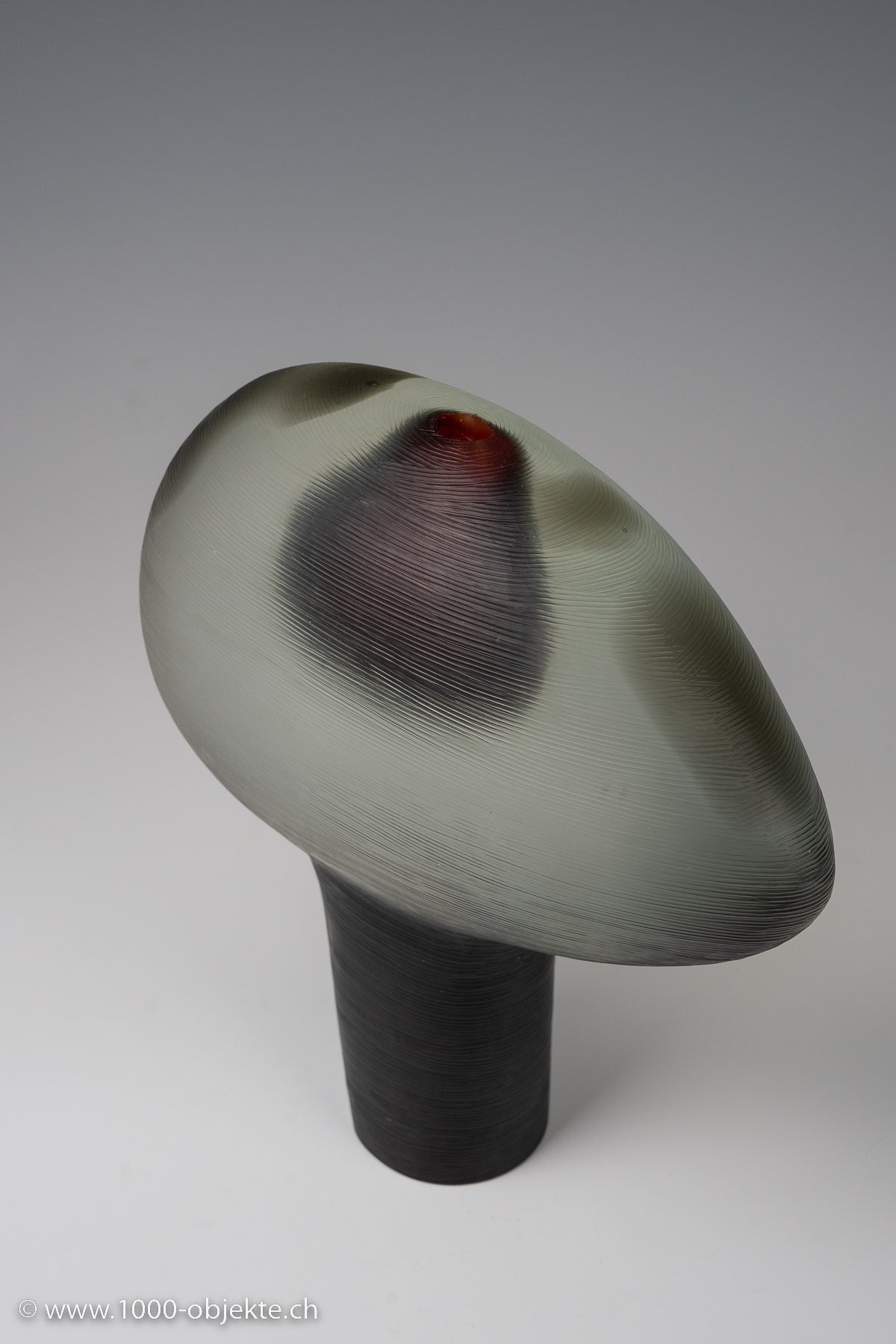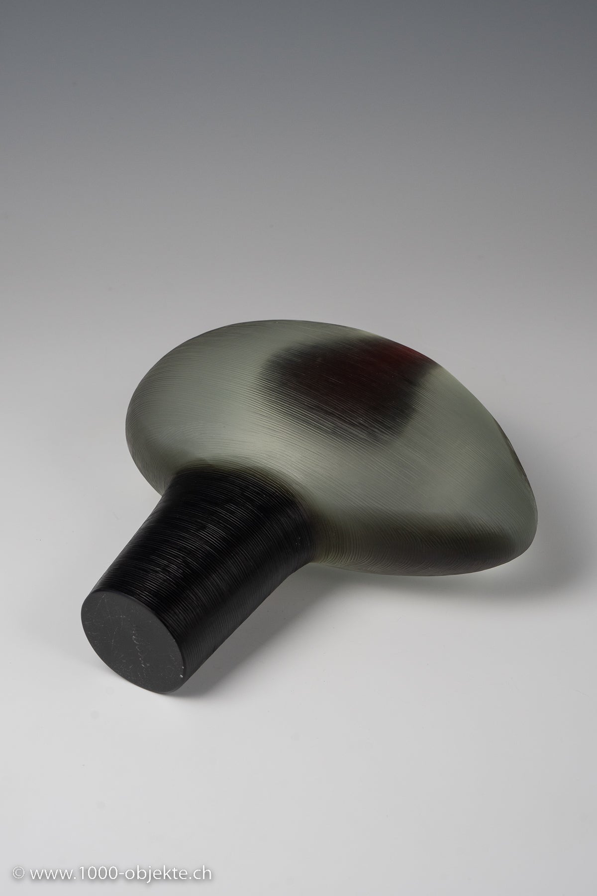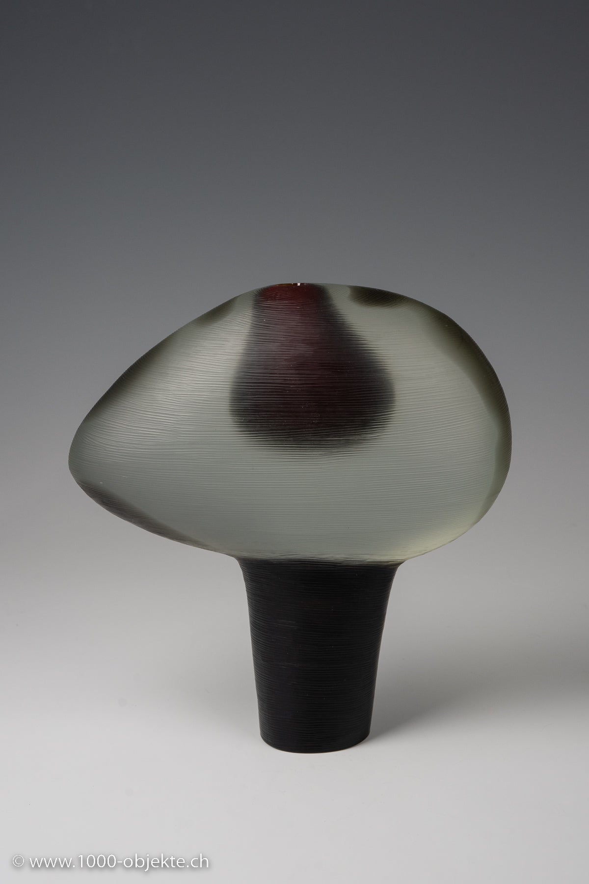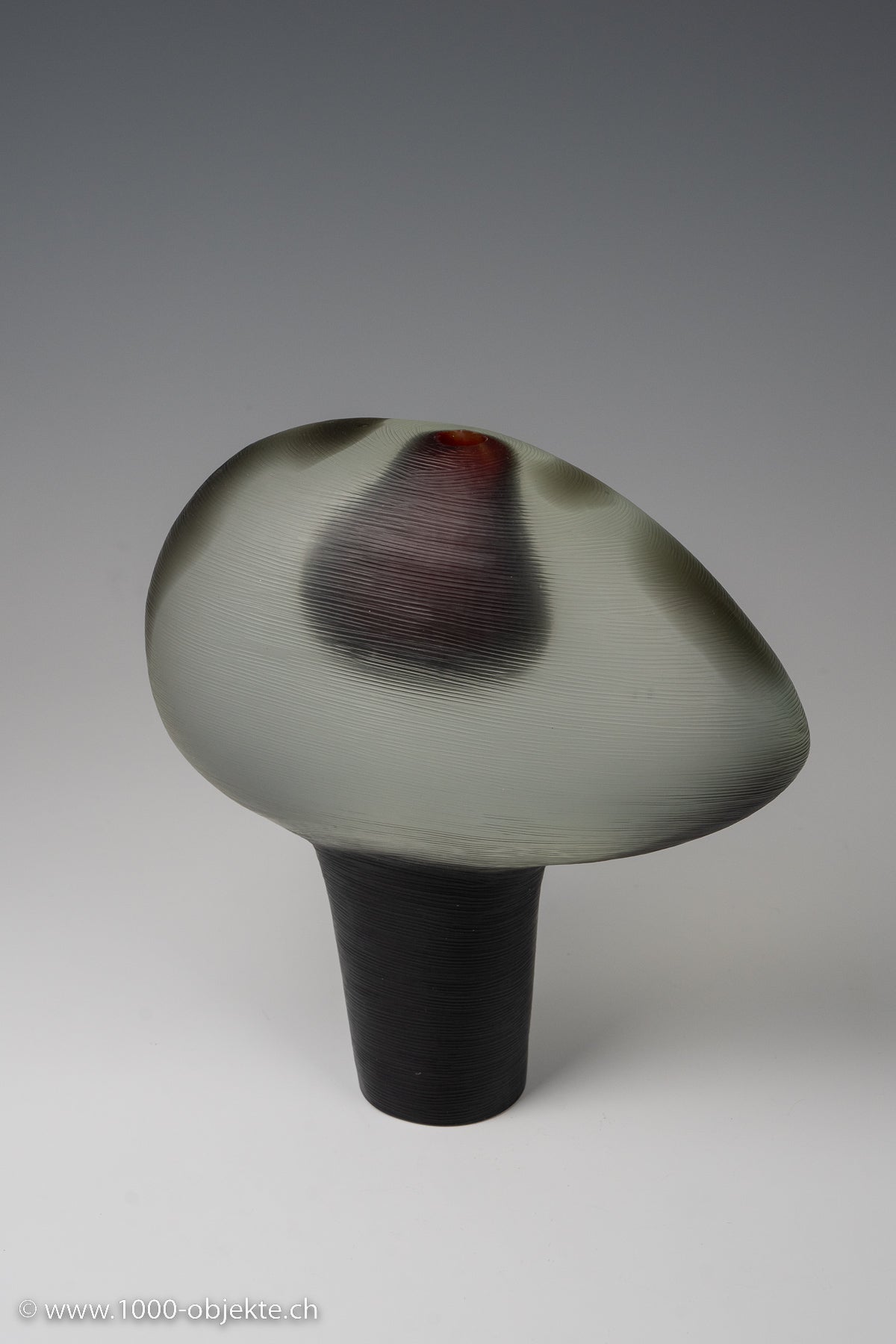 clear cased glass body with submerged layers in ruby red and partly smoke-brown tinted glass; surface finished with all around small carved grooves in inciso-technique; vase body in flat-oval bulb form on cylindrical foot