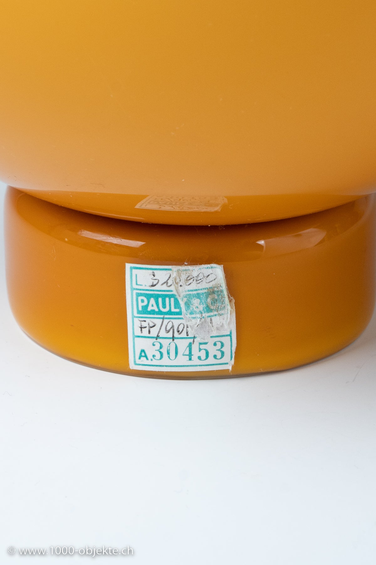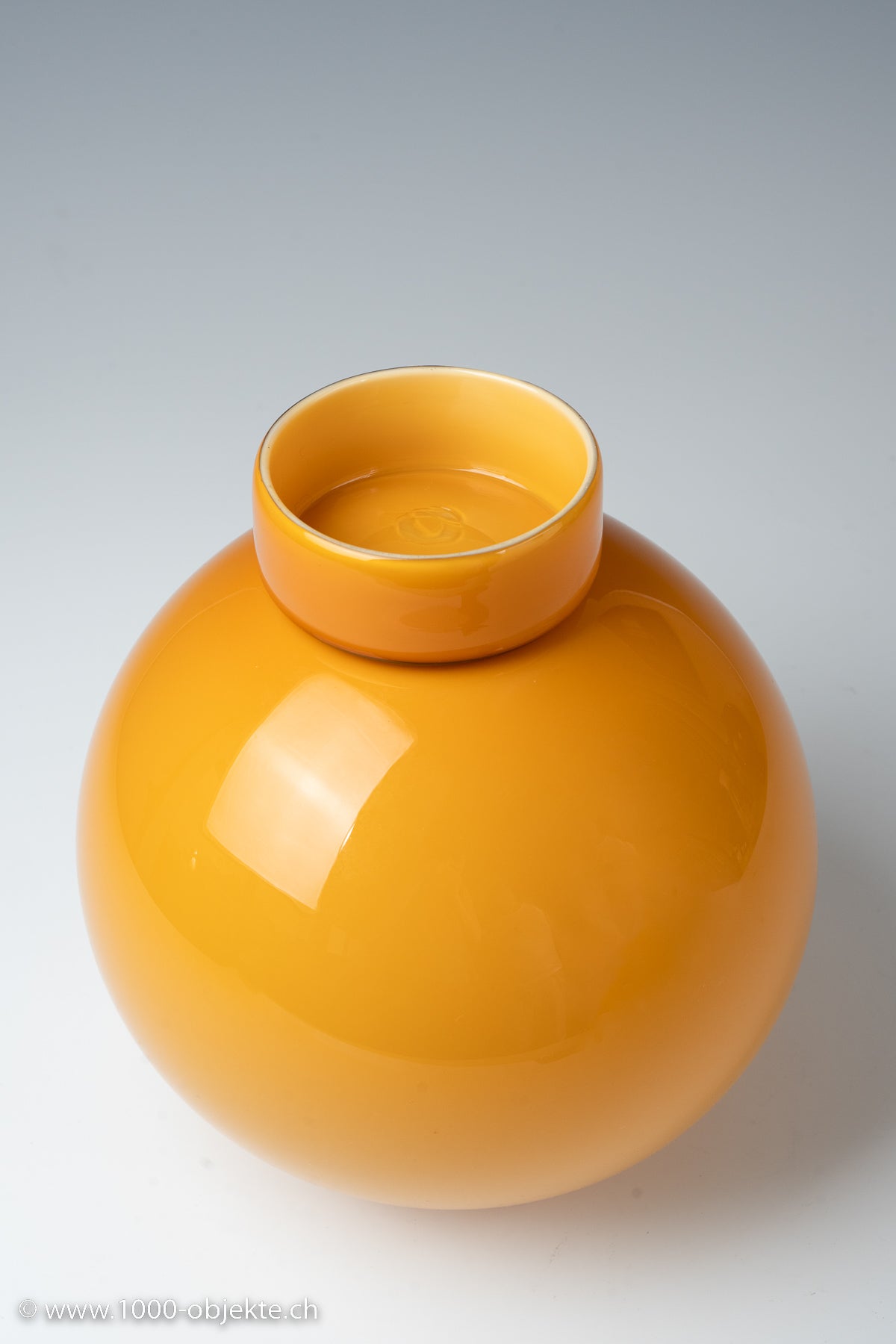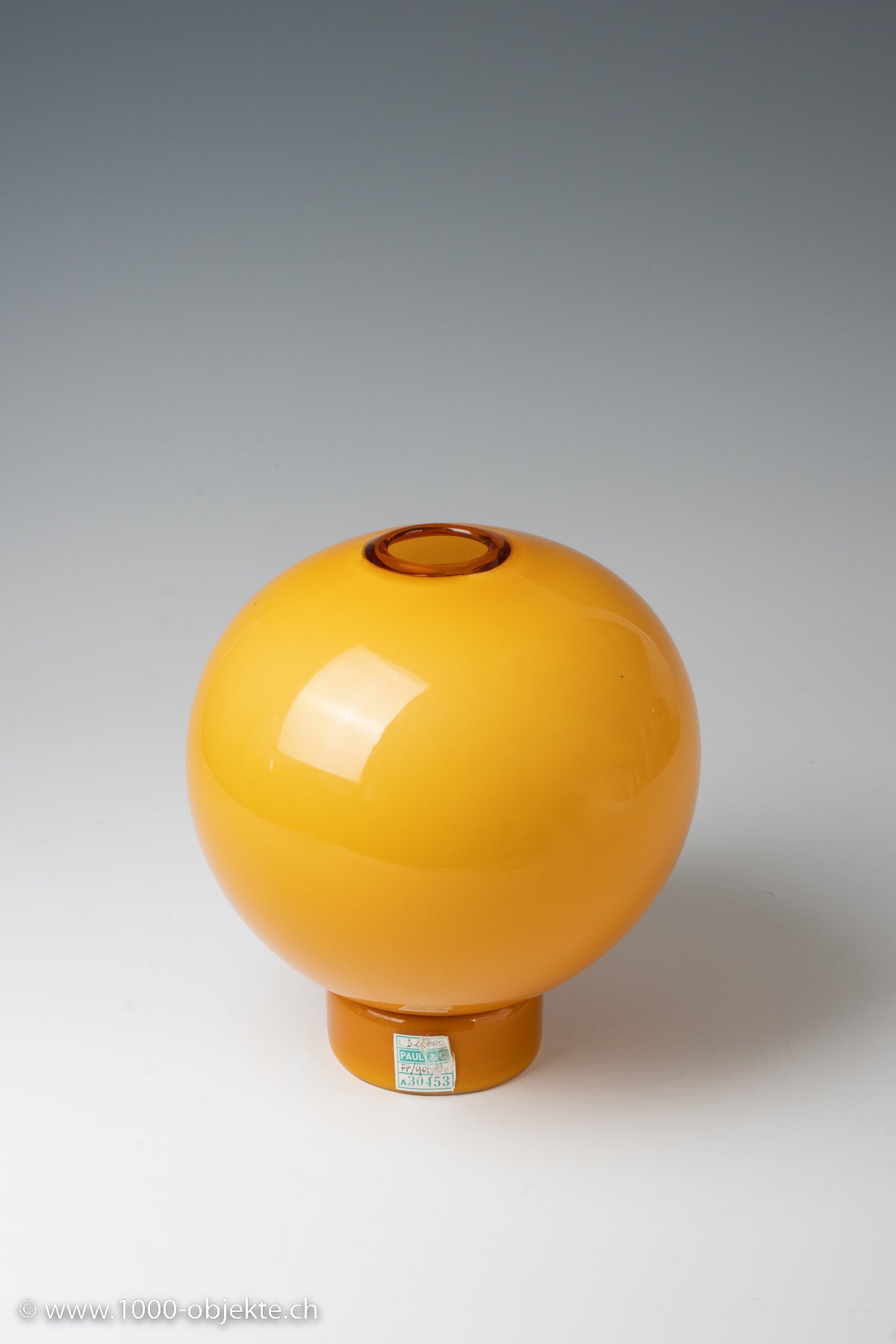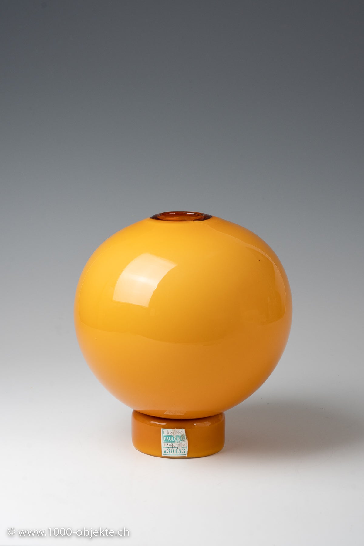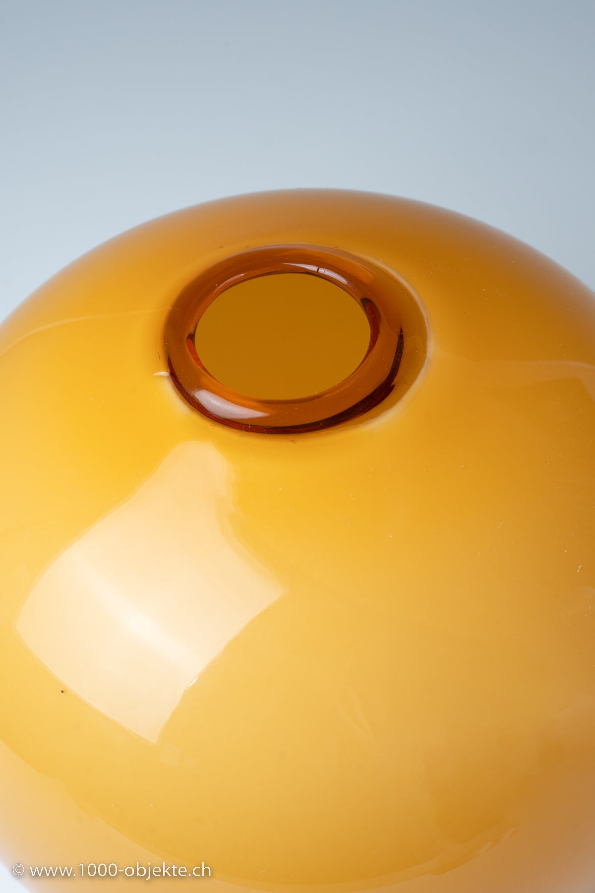 amber-colored glass, opaque white underlay; base and mouth are transparent amber; spherical shape on a cylindrical stand.