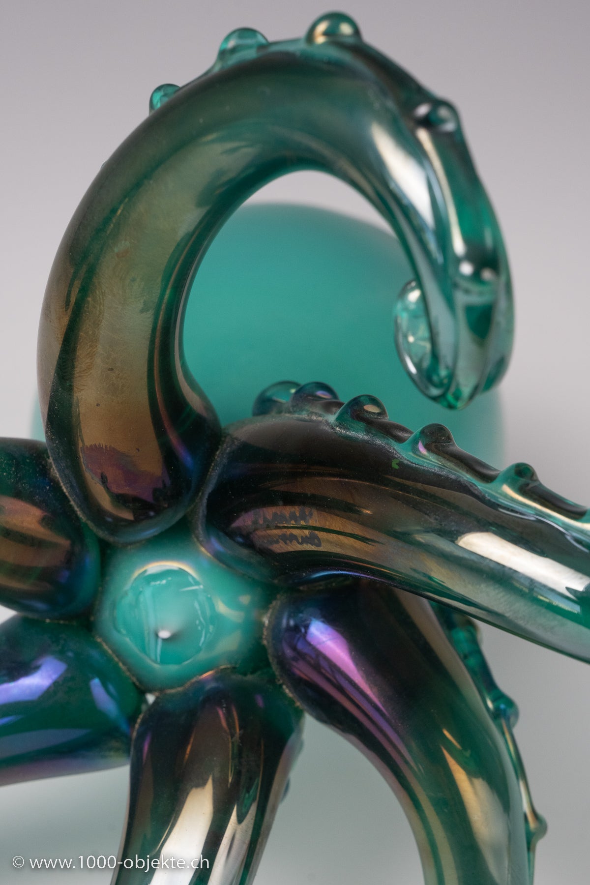 in lattimo and blue flashed glass, with blue Savoy millefiori (pearls), murrine and ribbed tentacles in light blue transparent glass, strongly iridescent surface