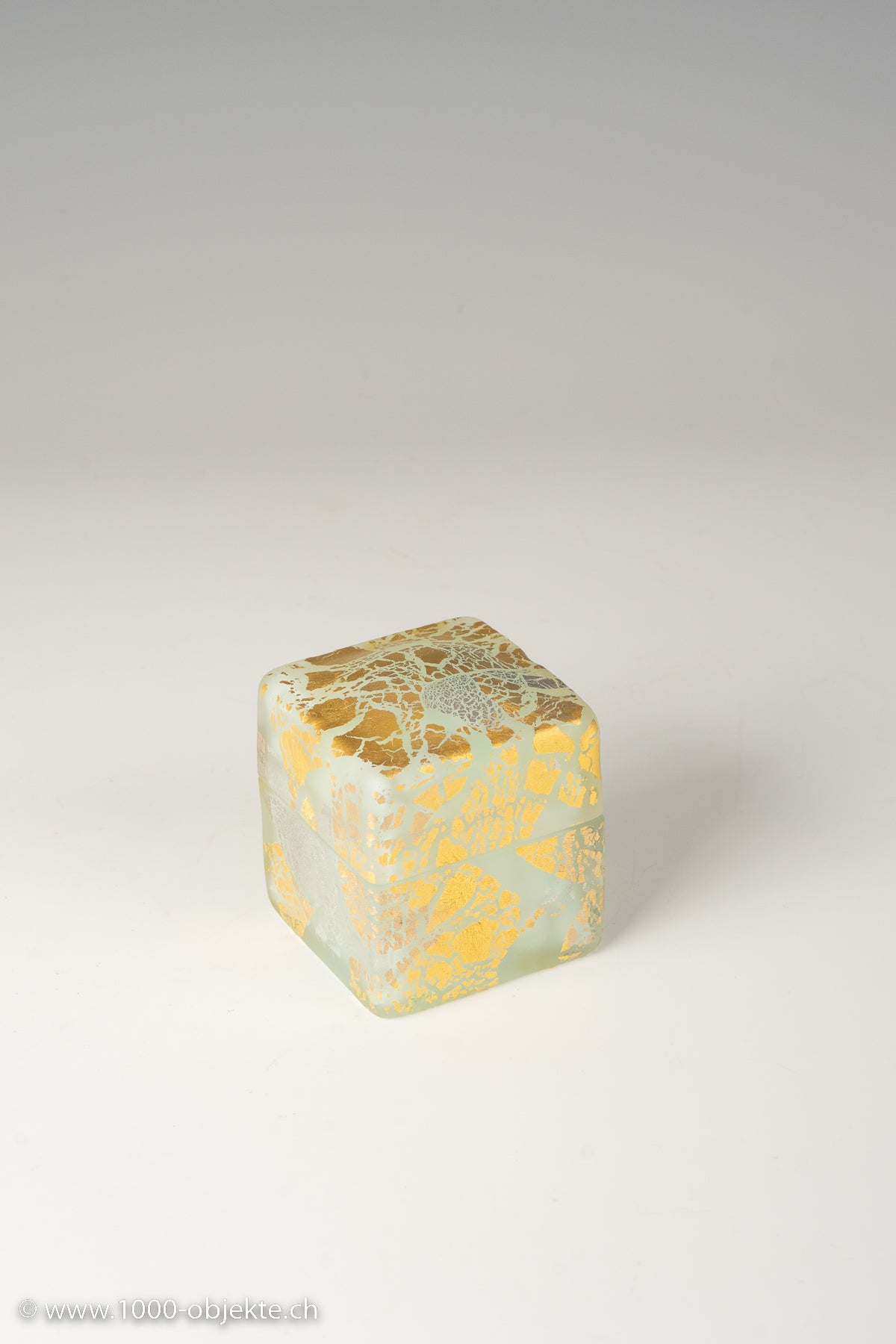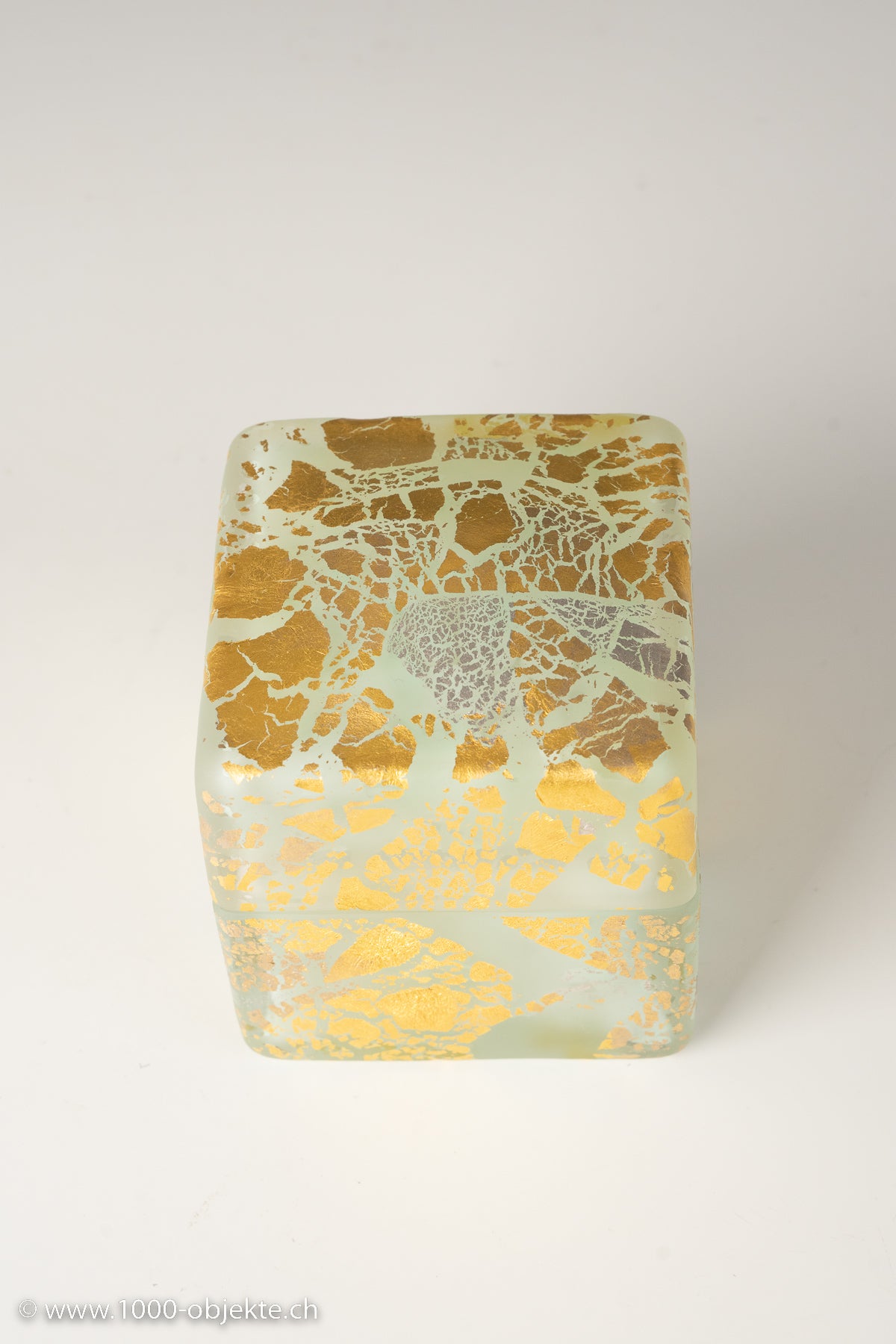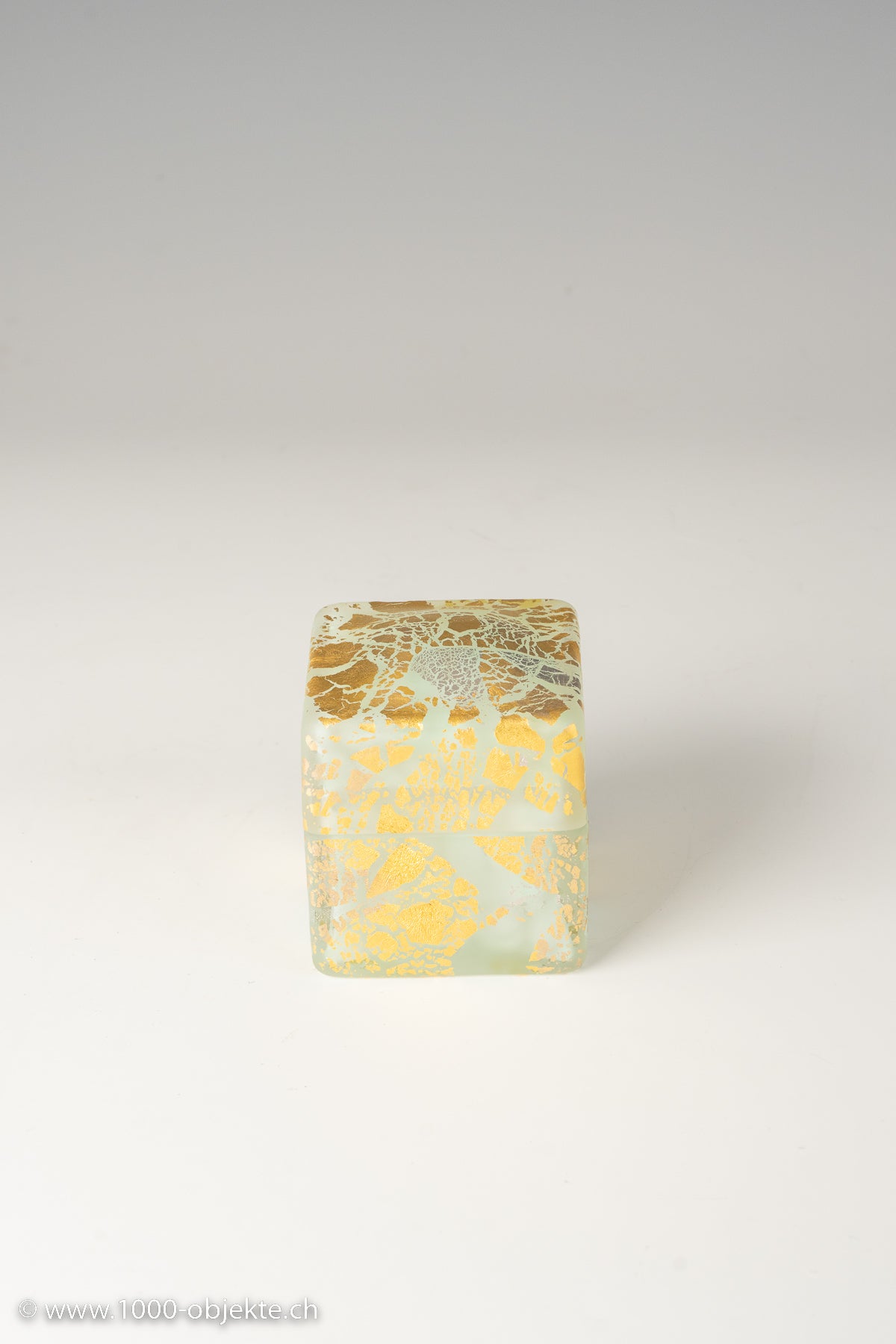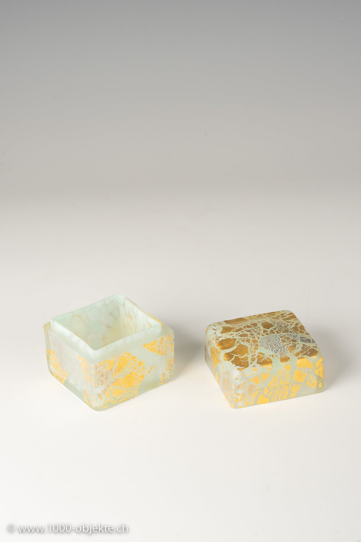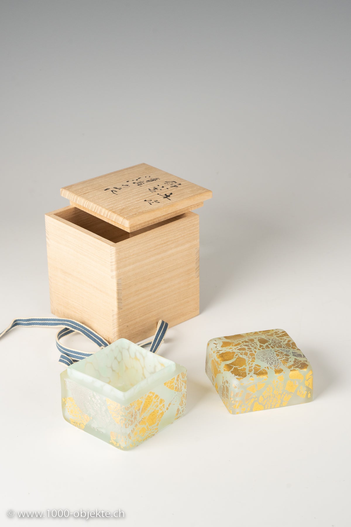 Fujita, Kyohei - Deckeldose (Kazaribako) in originaler Holzkiste. (Tokio 1921-2004 Chiba) Quaderform mit abgerundeten Kanten. Farbloses Glas mit eingeschmolzenen Krümeln in Weiß-Grün sowie Verschmelzung von gesprungener Gold- und Platinfolie. Auf dem Sockel signiert ''Kyohei''; Deckel des Holzkastens betitelt, innen signiert und gestempelt. 9 x 7,5 x 7,5 cm; Schachtel mit Papierdeckel und Textilverschlussband ca. 12 x 11 x 11 cm. // Fujita, Kyohei Deckeldose (Kazaribako) in originaler Holzschatulle (Tokio 1921-2004 Chiba) Quaderform mit gerundeten Kanten. Farbloses, säuremattiertes Glas mit eingeschmolzenen Kröseln in Weißgrün sowie Aufschmelzung aus gerissener Gold- und Platinfolie. Am Boden sign. ''Kyohei''; Deckel der Holzbox betitelt, innen sign. und gestempelt. 9 x 7,5 x 7,5 cm; Box mit Papierhaube und textilem Verschlussband ges. ca. 12 x 11 x 11 cm.
