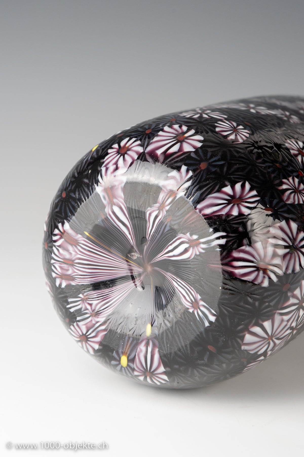 clear glass with fused Kiku murrine in black, white and gray with a yellow or red core
