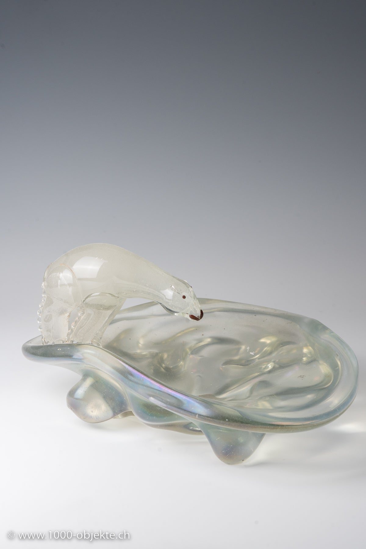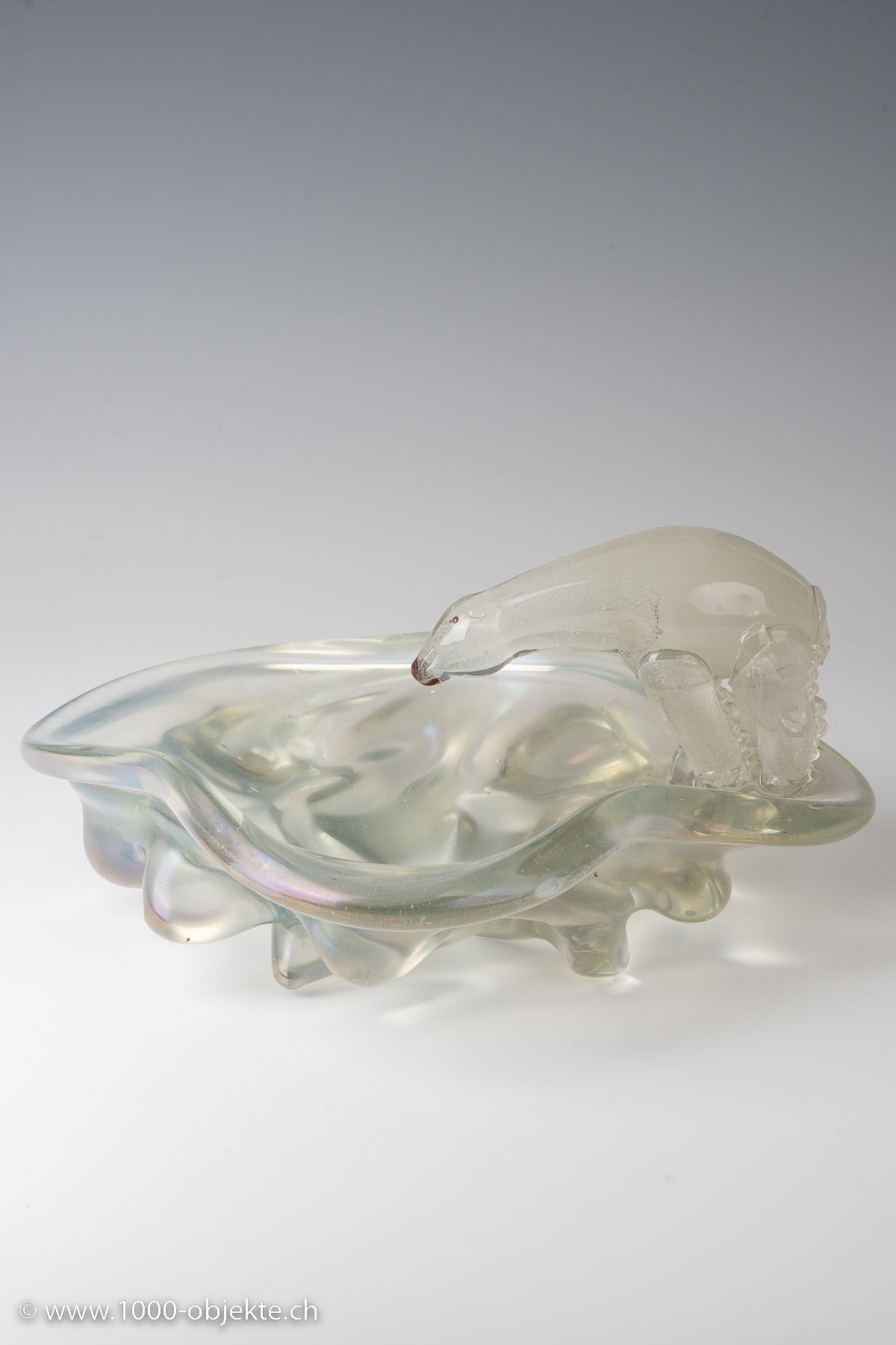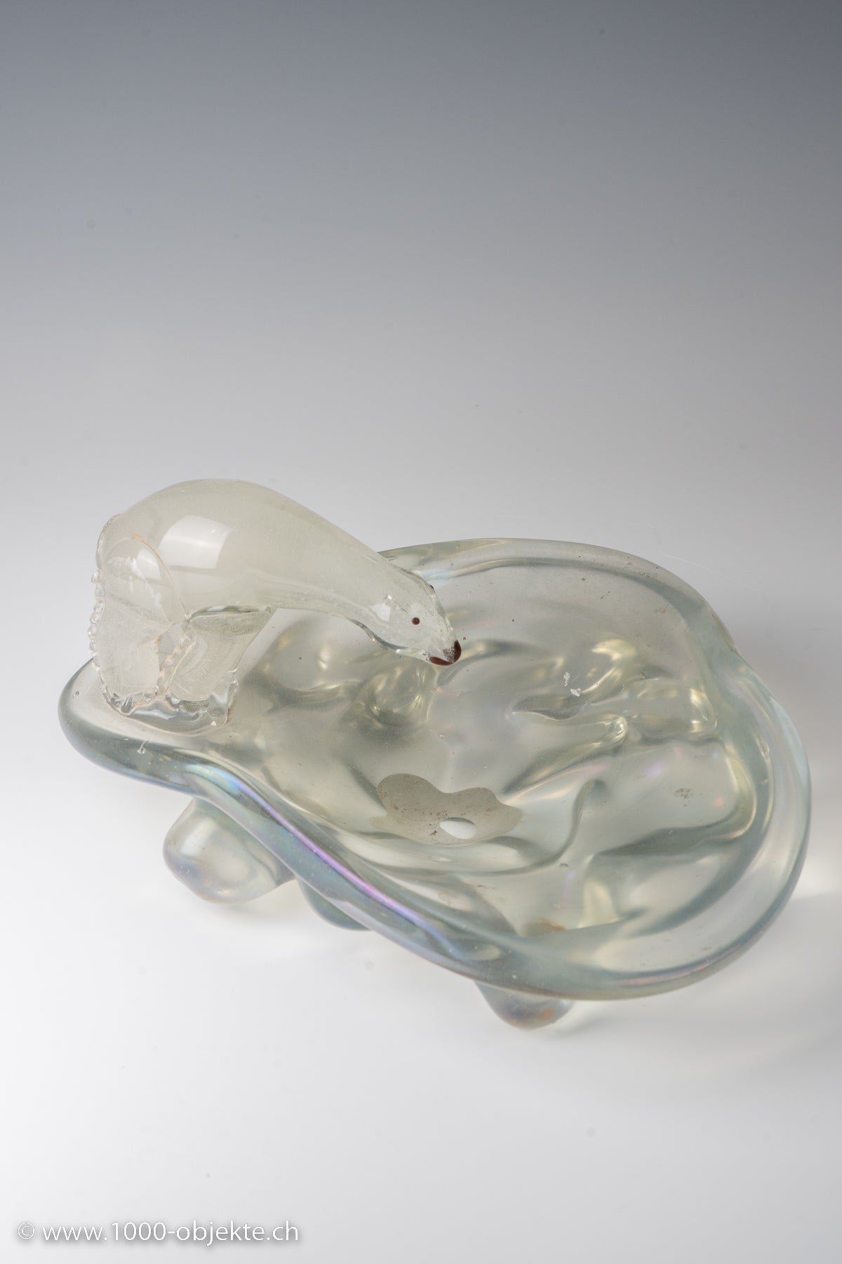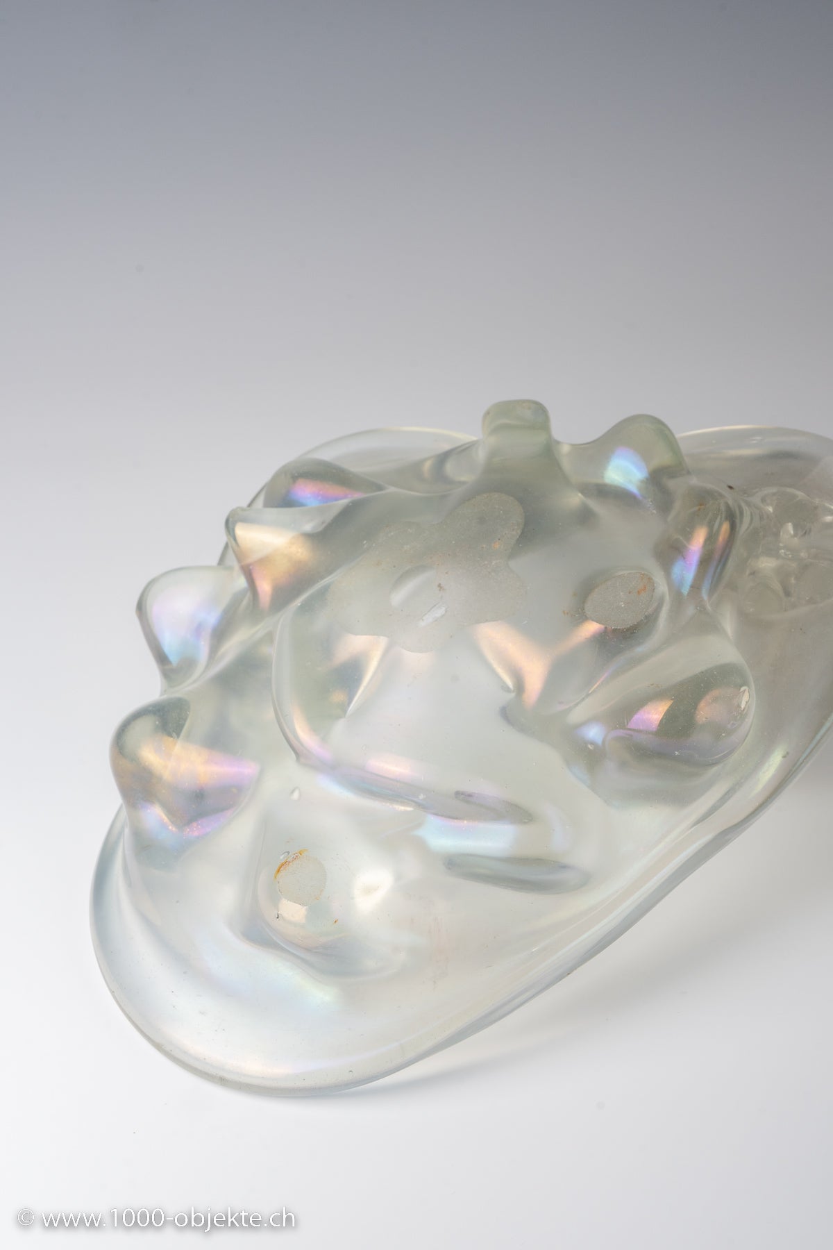 transparent glass with a figure in submerged bullicante glass; strongly iridescent surface