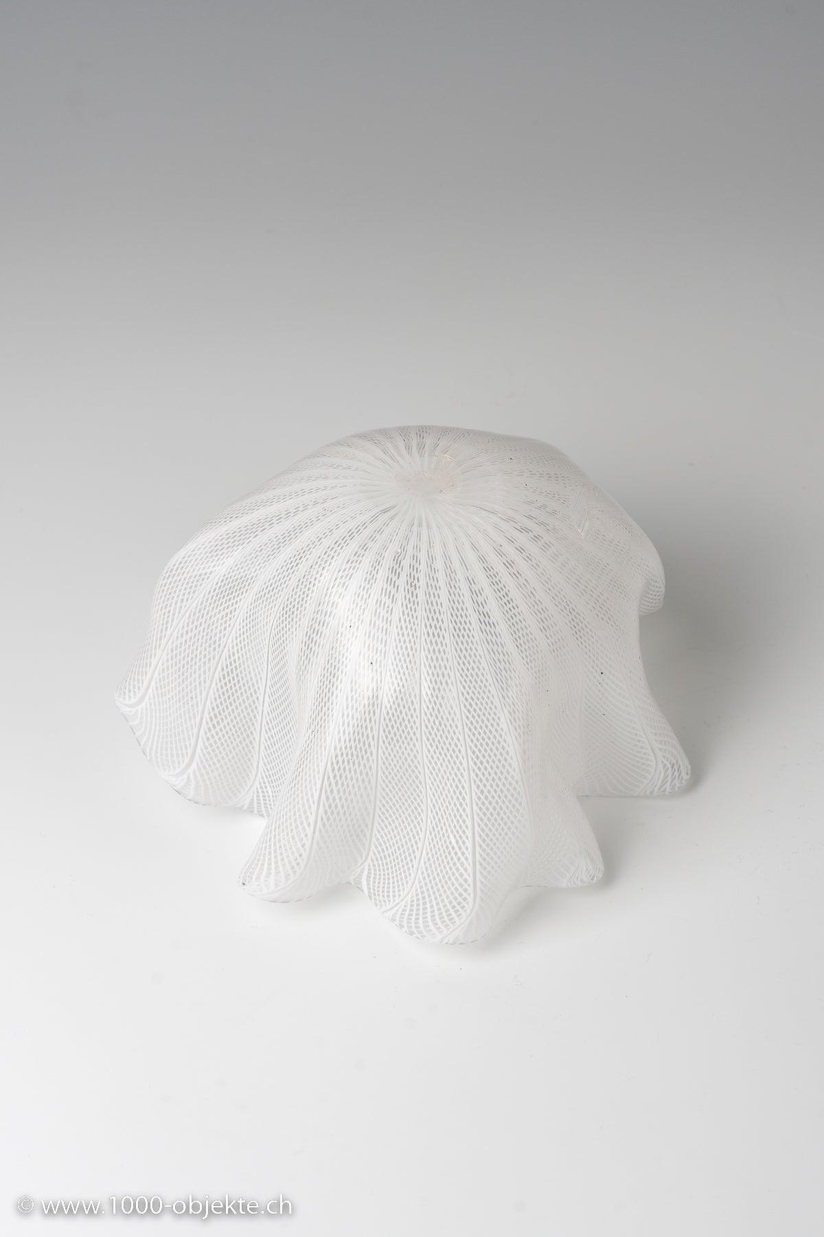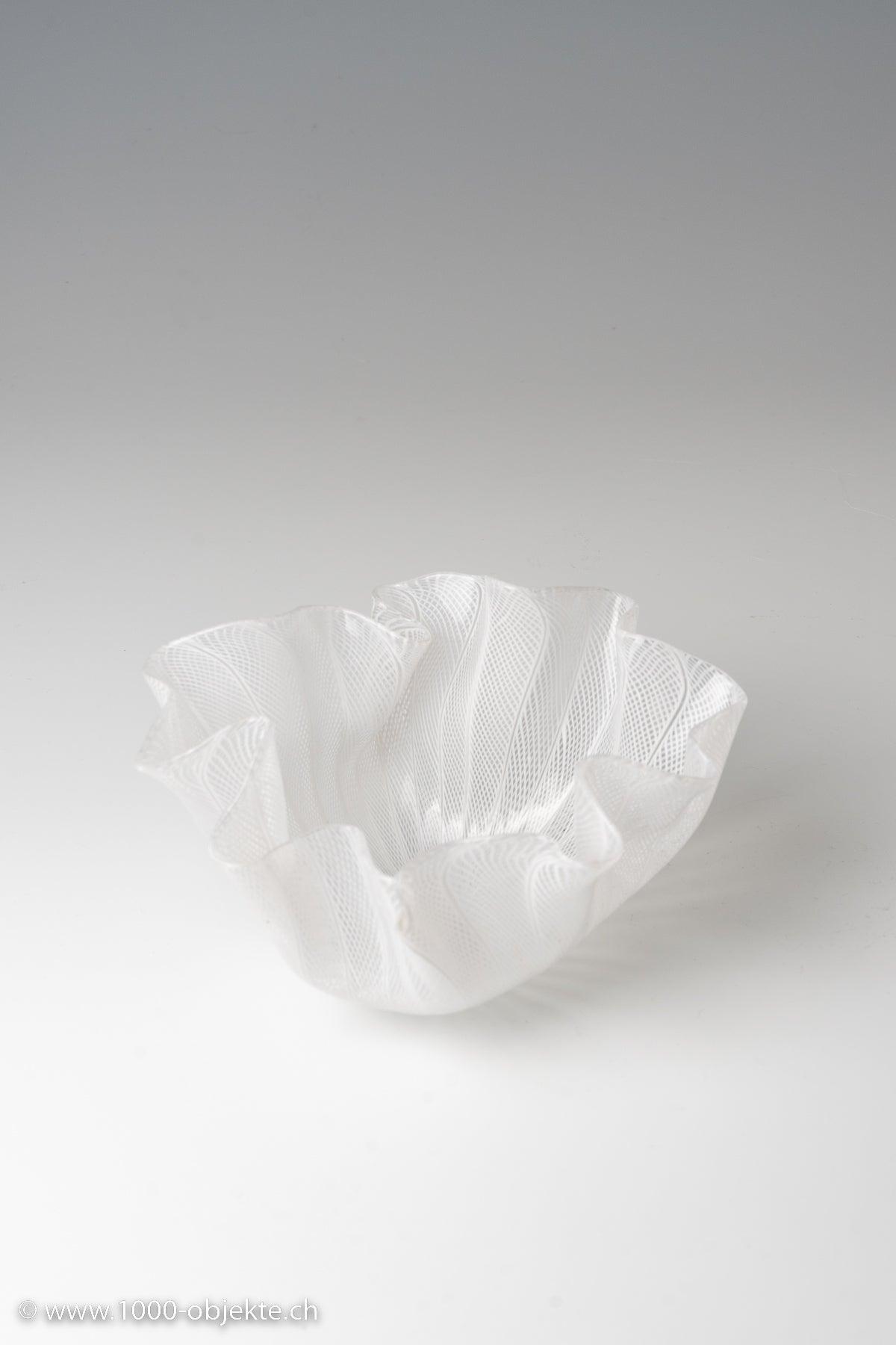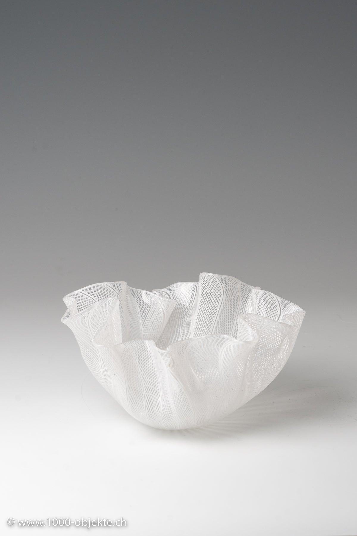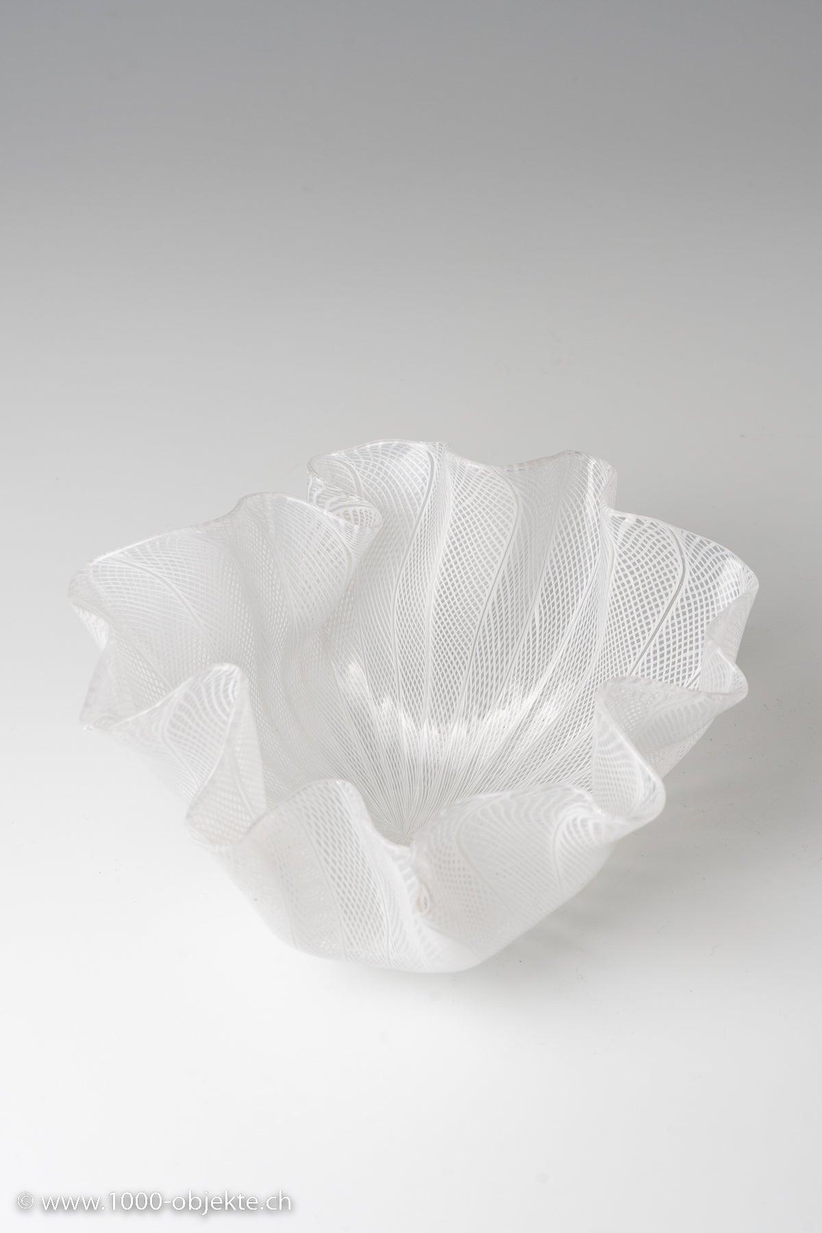 Handkerchief'' vase ''zanfirico'' Fulvio Bianconi for Venini, Murano, ca. 1955 Colorless glass, with white 'zanfirico' glass rods.  Marked: venini murano ITALIA (etching stamp). H. 10,5 cm D. 18,5 cm.