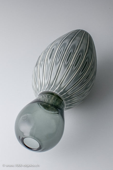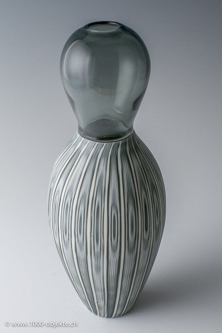 • Grey Blue tinted glass is worked murrine rods black u . white glass with murrine inclusions , frosted