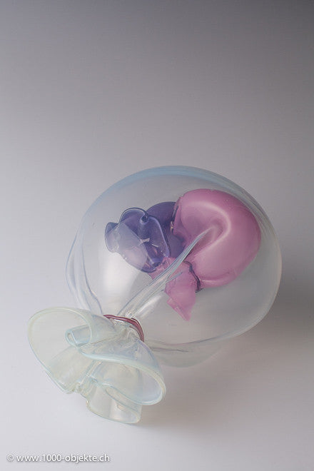 Colourless glas , underpinned with blue-green opal, gimped with yarns in bright pink opal and brown, blown ribbed mold. The threads on the wells torn partially. Surface iridescence.
