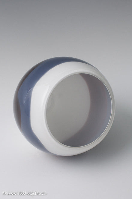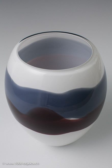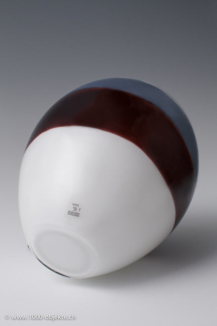 • Effetre Vetri di Murano Glass Vase,1989, signed, opaque white glass, flashed colorless , melted ribbons in opaque gray and burgundy .