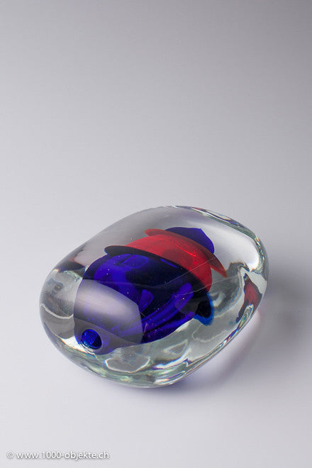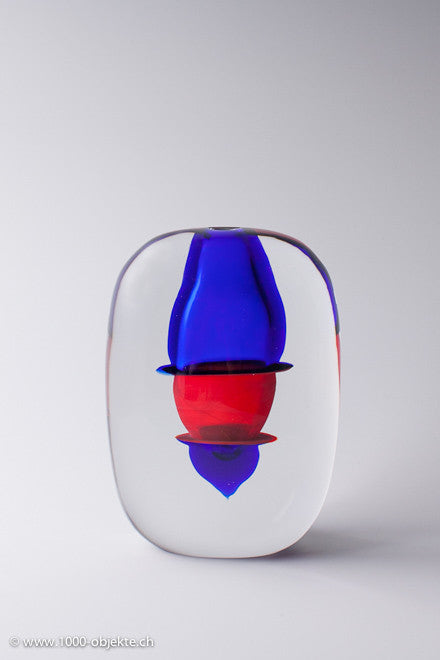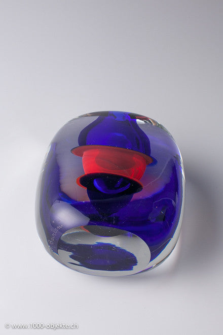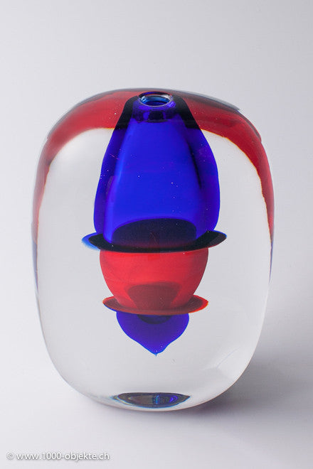 • It features colorless crystal glass and two other different colors - blue,and red - which bleed into the main glass (incalmo)