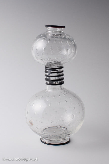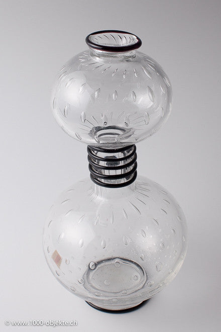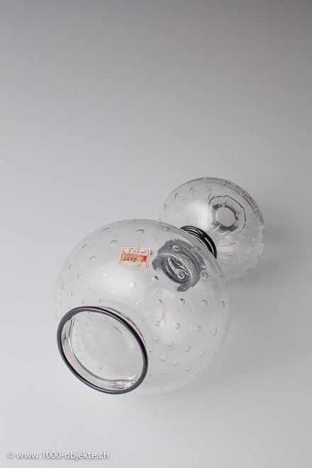 disc-shaped foot and trim in black pasta vitrea, light greenish tinted glass, embedded regular bubble inclusions, decorated with rotating band covers in black pasta vitrea