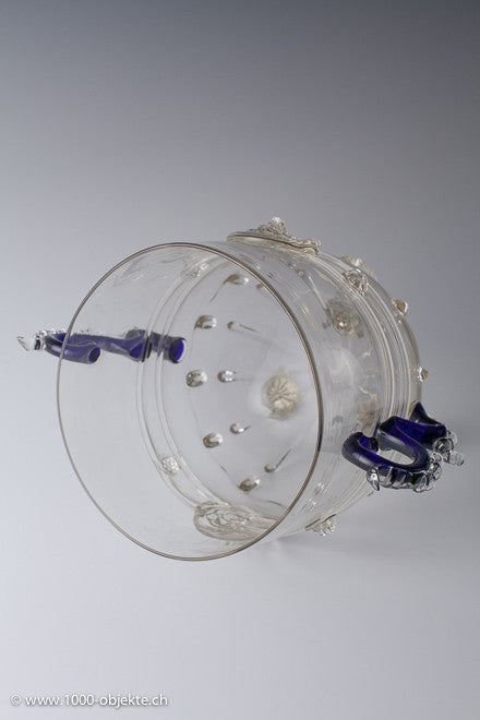 light greenish tinted glass, regularly superimposed tiered bubble inclusions, two fused spiral handles; applied decorations