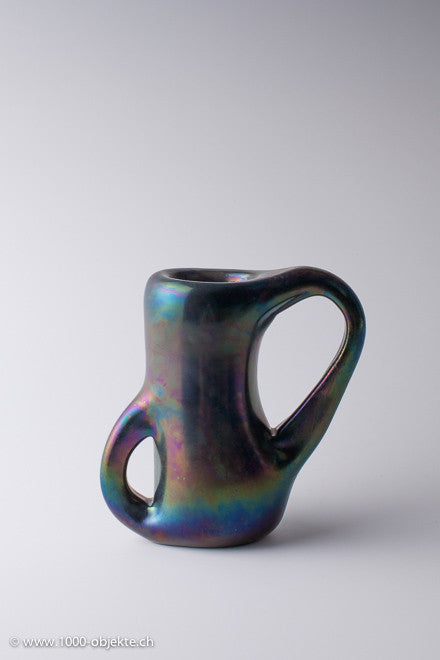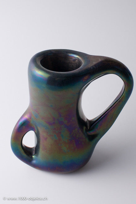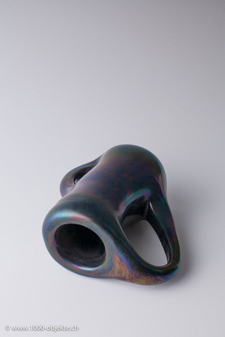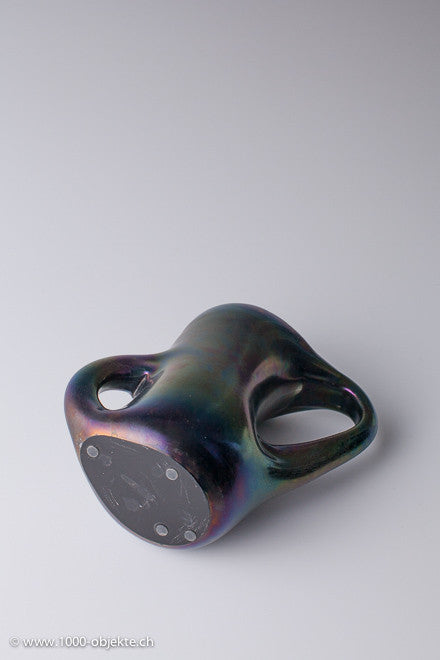 • Heavily iridized transparent black glass, characterized by large side handles, obtained by piercing a hole through the wall of the object,design, Giorgio Ferro for A.VE.M.