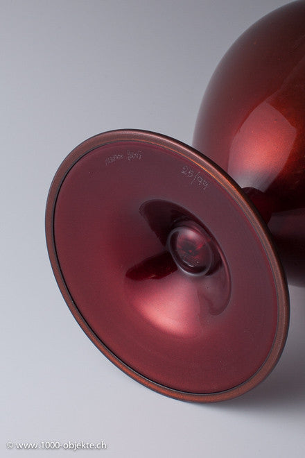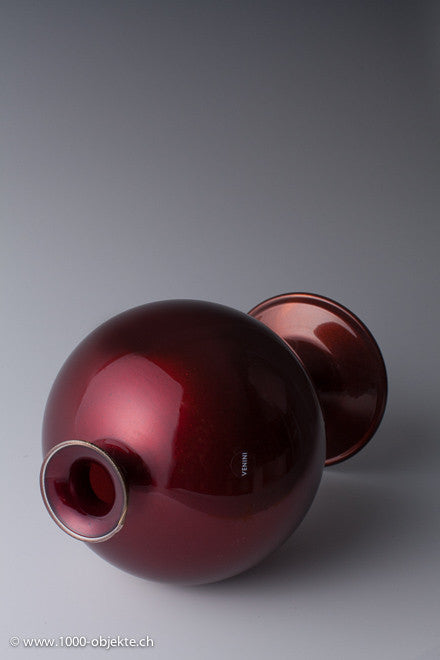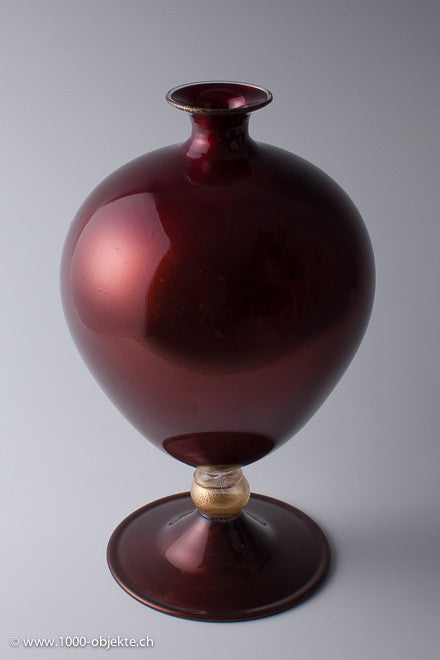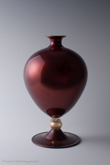 • Burgundy red with "aventurine". Blown glass. The Veronese vase was blown for the first time in 1921 thanks to Vittorio Zecchin’s intuition. The artist, who was Venini's art director from 1921 to 1925, took inspiration from a painting by Paolo Veronese, finished in 1580, which is today kept at the Accademia Galleries in Venice: “The Annunciation”. The glass work was so successful, that it became the firm’s logo.