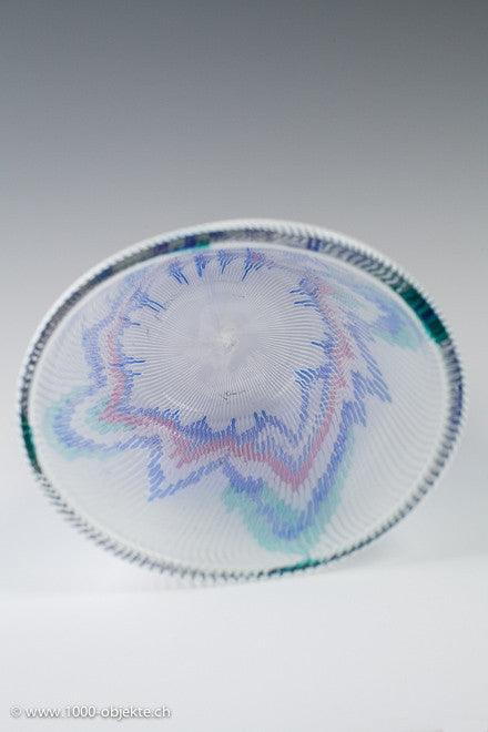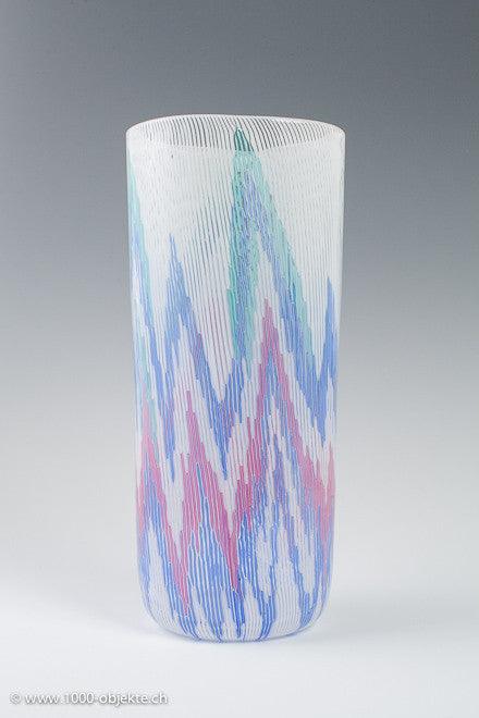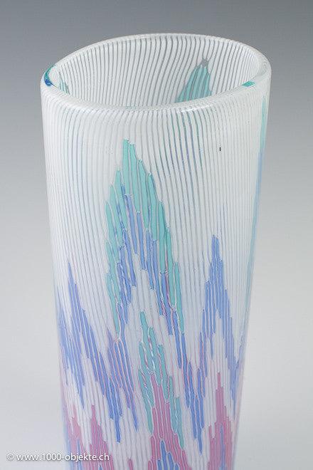• A "Fiamme" vase, designed by Barbara del Vicario for Venini, dated 1984, featuring flames composed of mosaic-like cane segments of mint-green, creamy-blue, flesh-pink and milk-white.
